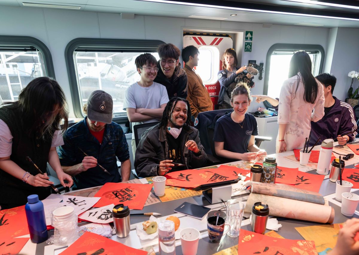 Students engage in cultural exchange activities aboard the OceanXplorer research vessel.